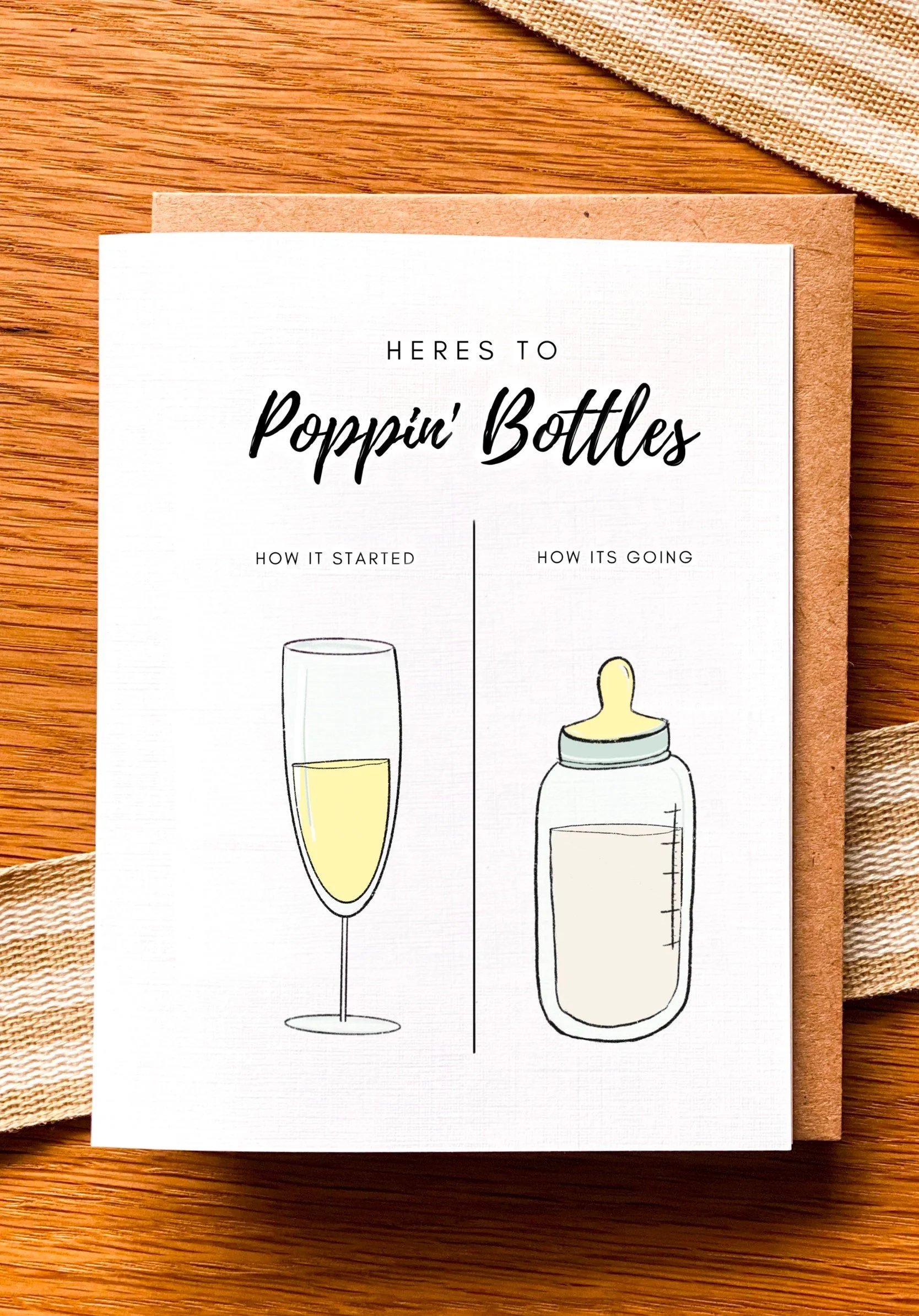 Baby cards with the cute giraffe and cribs are cute, but this “How it started versus How it’s going” card with “Here’s to Poppin Bottles” at the top is perfect for the couple who loved to party before becoming parents!